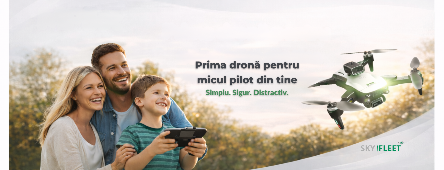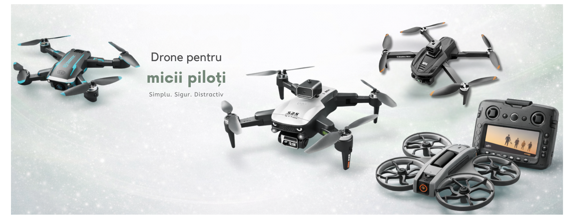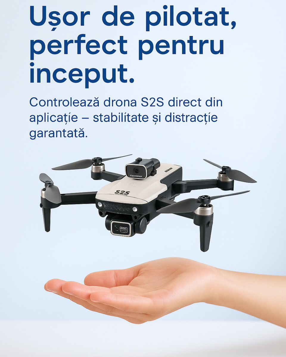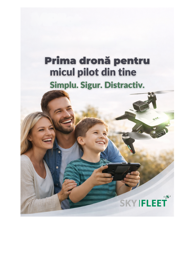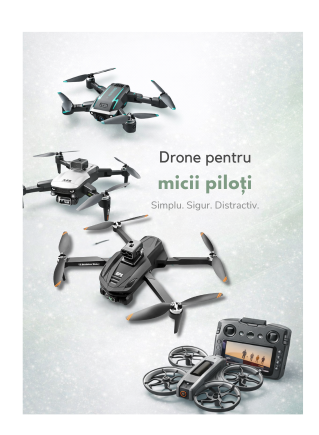 📦 Pachet complet: dronă, telecomandă, baterii, cablu USB, palete rezervă